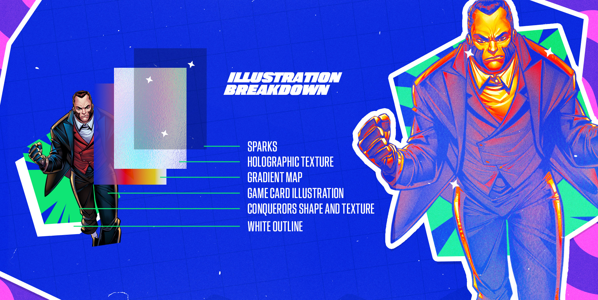Leveraging the captivating card and variant illustrations from the "Hellfire Gala" season as a baseline, we crafted a dynamic series of graphics combining winter and holiday celebration elements with the classic CONQUERORS location shape, to create a modular system that can absorb a large variety of characters and elements without losing it's consistency and visual appeal.